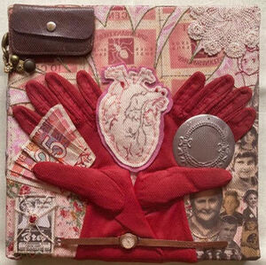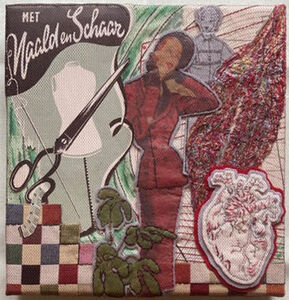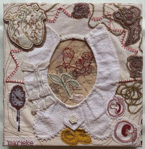 Collage's van textiel papier en kleine objecten verbonden door textieltechnieken en/of mixed media